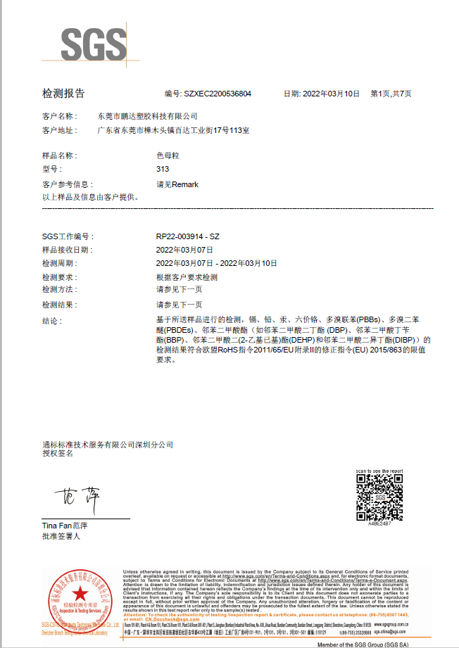 和鵬達塑膠科技有限公司合作很長一段時間了,他們的產(chǎn)品質(zhì)量好,服務到位,且原材料都通過SGS測試符合歐盟REACH,PaHS、ROHS及無鹵指令,備有美國FDA級食品接觸規(guī)格物料,和他們合作完全沒有后顧之憂!